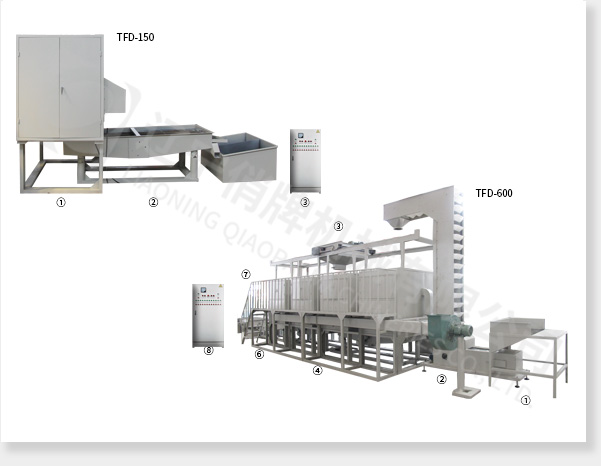 TFD-600型:① 上料斗 ② Z型提升機(jī) ③ 喂料小車 ④ 脫皮機(jī)(4臺) ⑤ 送料篩(2臺) ⑥ 除糠篩和分選篩 ⑦ 排塵系統(tǒng) ⑧ 電氣控制柜