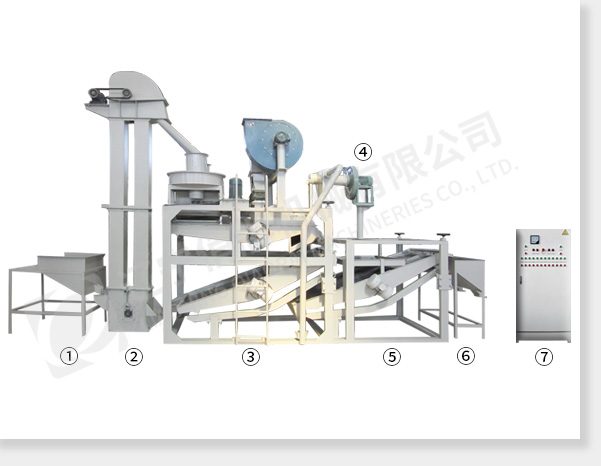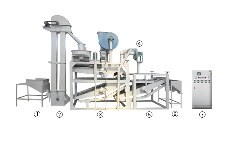 ① 上料斗②斗式提升機 ③ 脫殼、風選、分選主機 ④ 風力回料系統(tǒng) ⑤ 籽米復(fù)選機 ⑥ 接料斗 ⑦ 電氣控制柜
