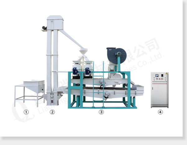 ① приёмный бункер ②ковшовый элеватор ③главная машина (шелушитель, вибросито для удаления шелухи и вибросито для сепарации нелущённой семечки и ядра) ④электрический управляющий шкаф