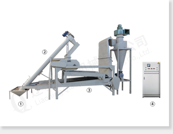 ①приёмный бункер ②спиральный транспортёр③главная машина (шелушитель, вибросито для удаления шелухи и вибросито для сепарации нелущённой семечки и ядра) ④электрический управляющий шкаф